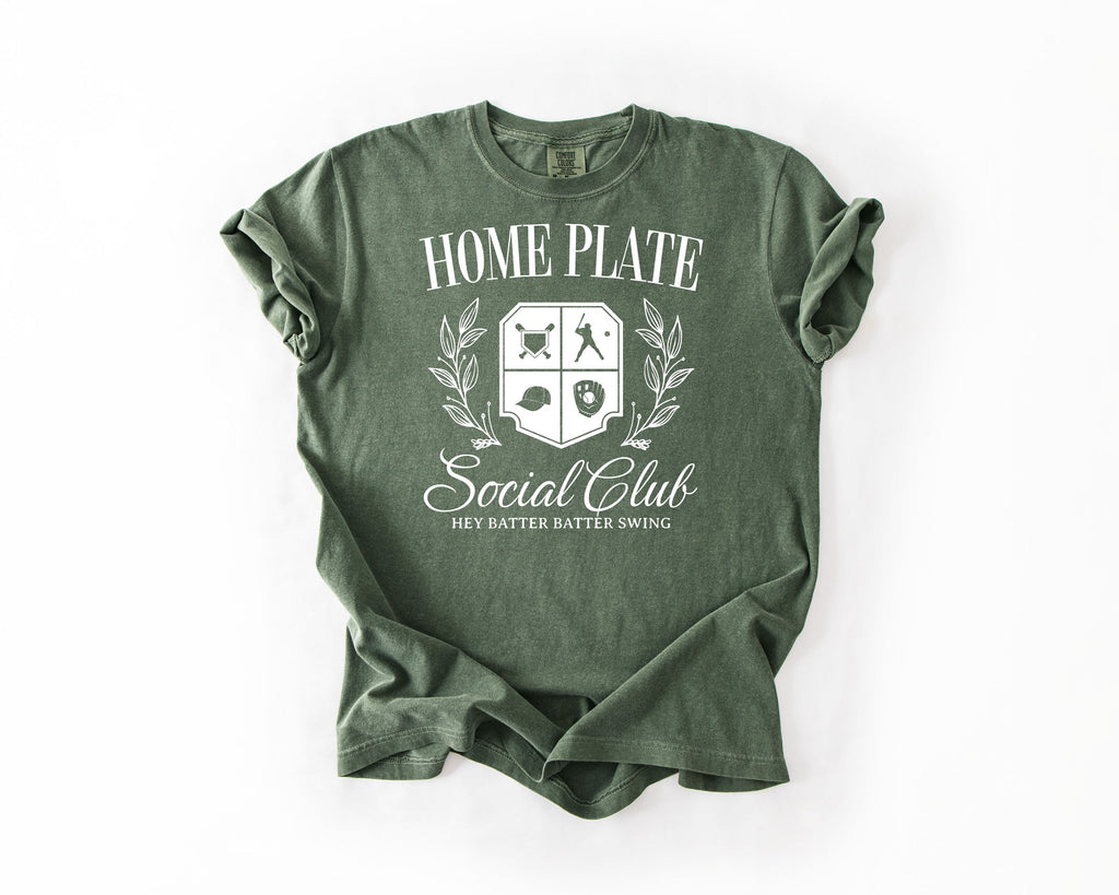 Home Plate Social Club Graphic Tee | Comfort Colors Step up to the plate and join an exclusive crew of baseball enthusiasts! This charming graphic tee celebrates the camaraderie, competition, and pure fun of America's favorite pastime. Perfect for teammates, die-hard fans, or anyone who believes the best memories happen at the ballpark, this shirt is your ticket to the club. Crafted on premium Comfort Colors fabric for that perfectly broken-in feel, it's ideal for game days, casual hangouts, or whenever you want to rep your love of the sport with style and humor.