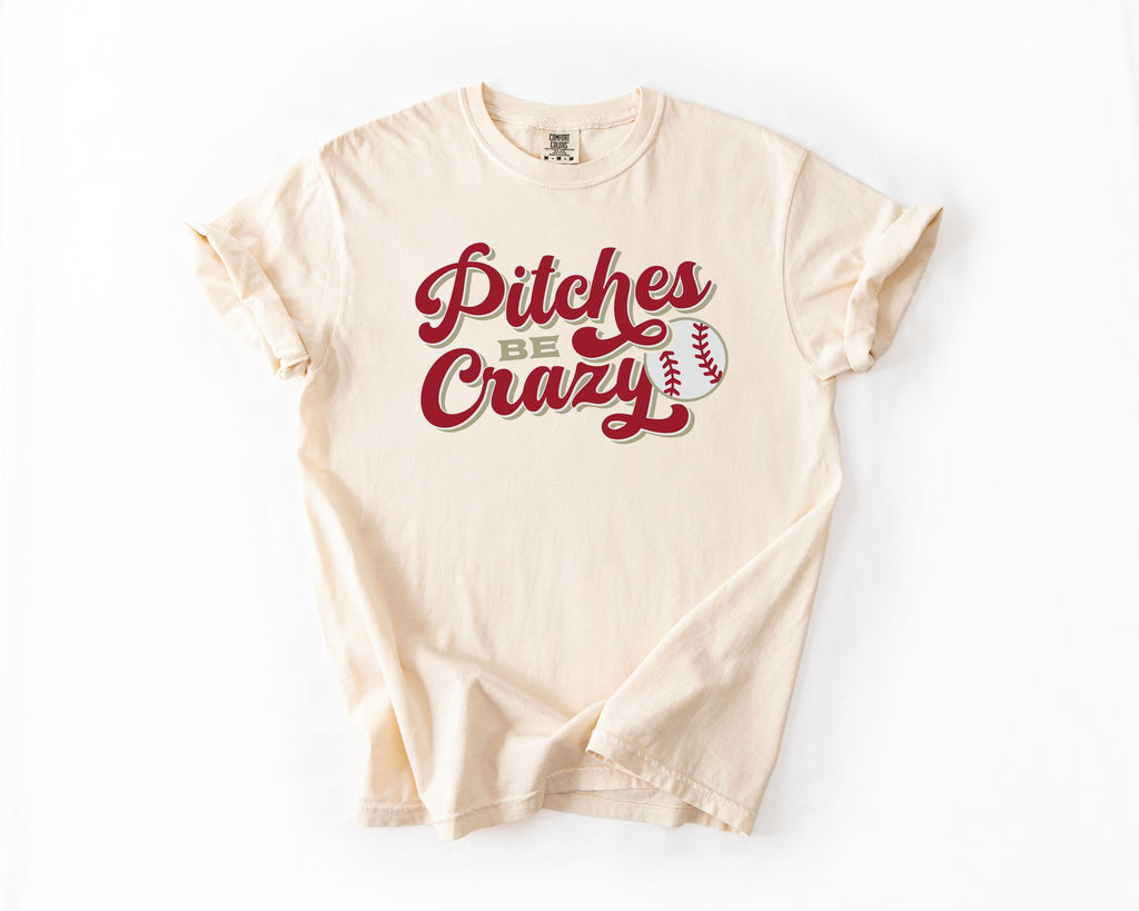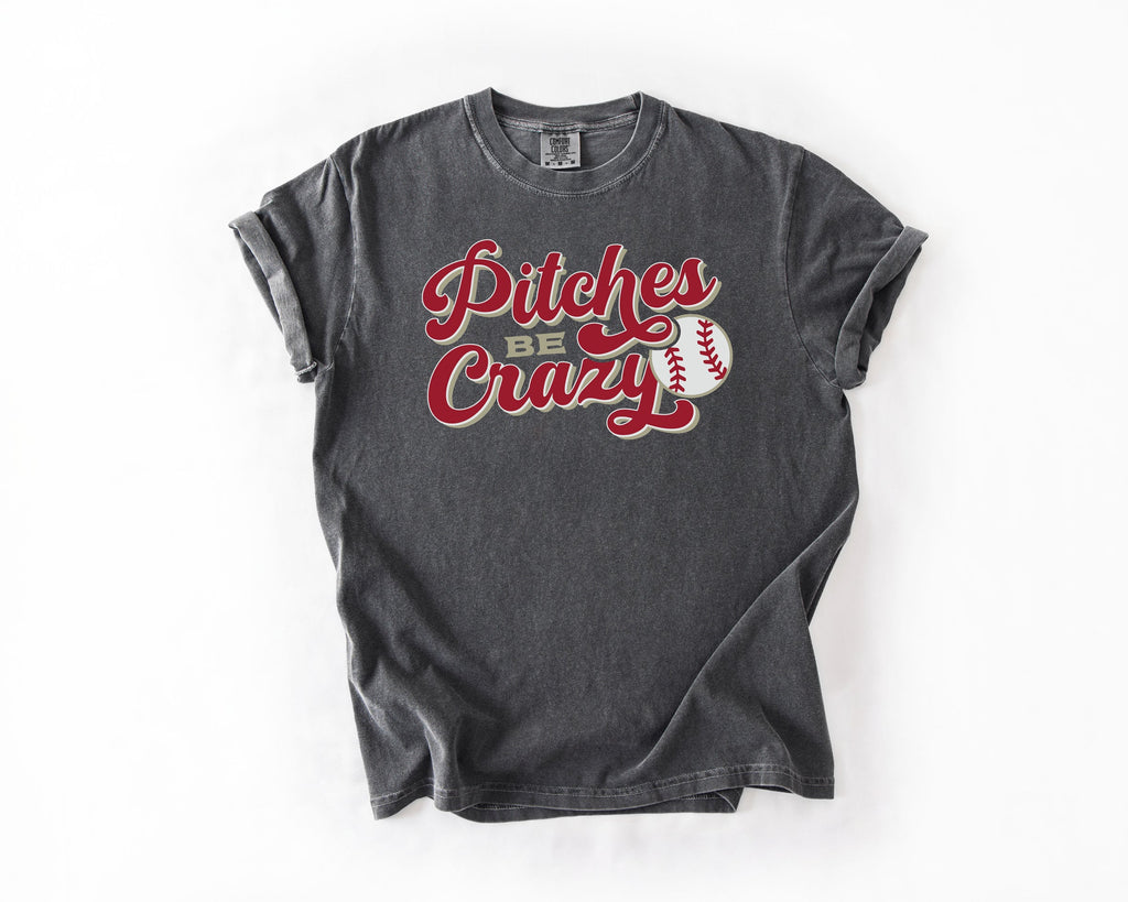 Pitches be Crazy Graphic Tee | Comfort Colors For anyone who's lived through the unpredictable world of baseball! This laid-back graphic tee captures the hilarious chaos of game day with a wink and a smile. Whether you're a player, a devoted fan, or someone who just appreciates the drama of the diamond, this shirt gets it. Printed on ultra-soft Comfort Colors fabric, it's perfect for cheering from the stands, relaxing at home, or making fellow baseball lovers laugh. Because sometimes the best moments are the wildest ones.